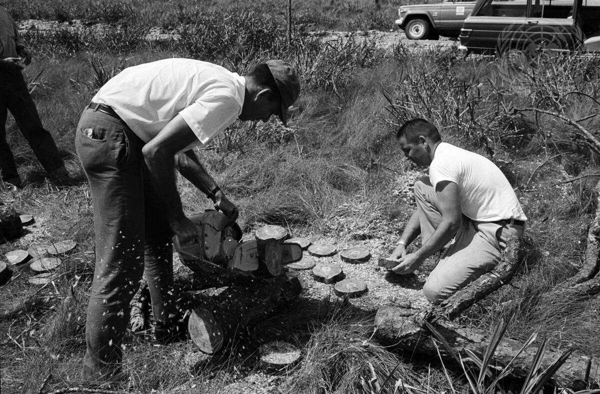 ‘Development of Forest Resources in Nicaragua. Slicing a log with a power chainsaw to detect the presence of parasitic insects in the area are I.H. Ingram, Nicaraguan counterpart entomologist (left), and FAO forest management expert Harry Yate (United States), 1971’ - UN7612813, UN Photo/Yutaka Nagata