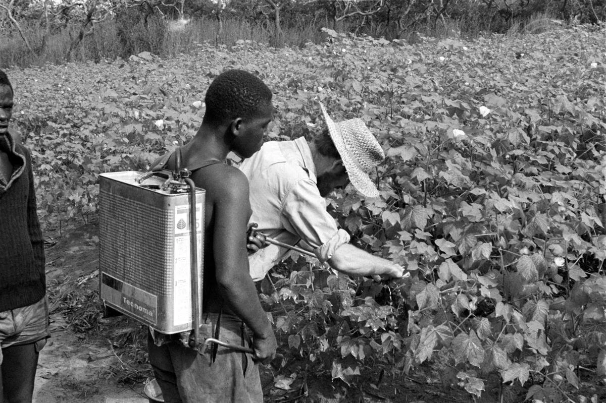 ‘Rural Development in Dahomey. Young farmers on a cooperative farm near Save prepare to spray the cotton crop. Jan Zwaan, the Dutchman who organized this farm for the Mission Protestante Methodiste, examines one of the cotton plants, 1968’ - UN7625570, UN Photo/PL
