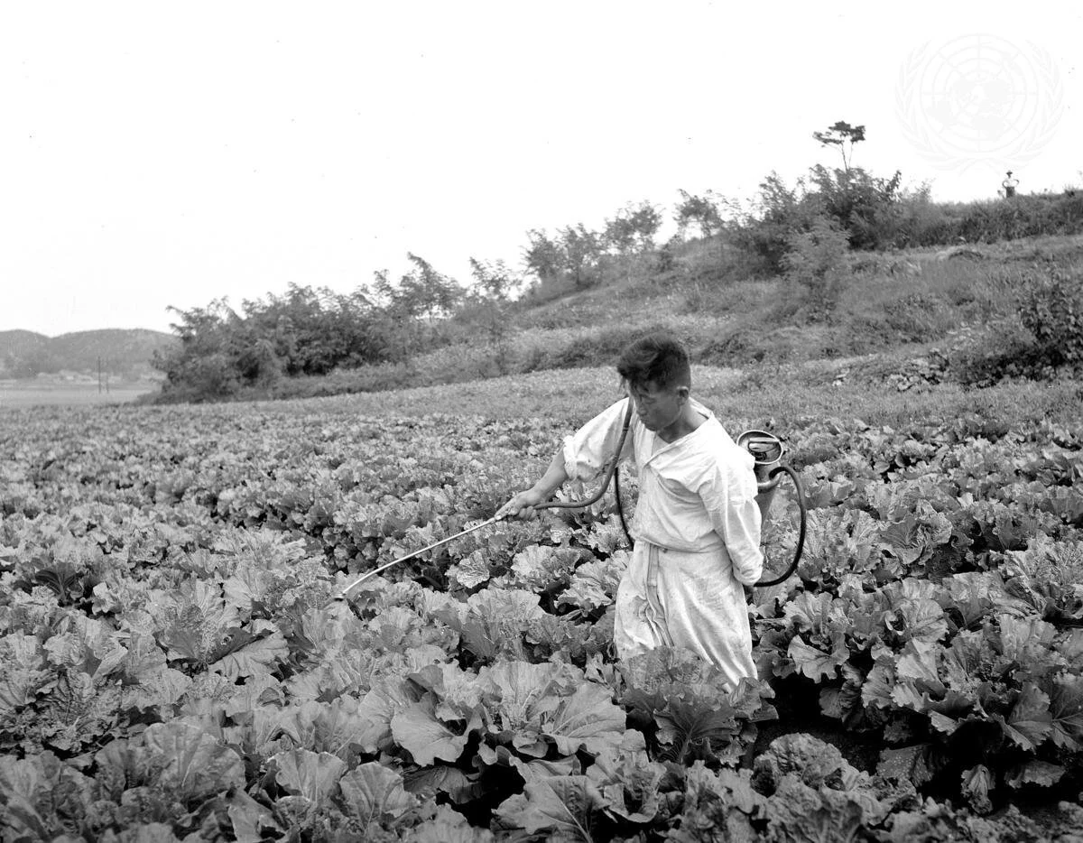 ‘To increase home-grown food supplies has been an important aspect of Korean reconstruction,often necessitating more productive methods. Greater use of insecticides has led to the production of healthier crops.’ [No exact date] Agricultural Rehabilitation in Korea (Background Photo), 1971 - UN7659444, UN Photo